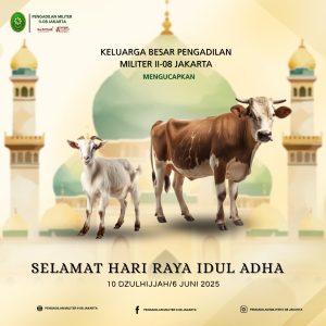 Keluarga Besar Pengadilan Militer II-08 Jakarta mengucapkan Selamat Hari Raya Idul Adha 1446 H. Semoga semangat berkurban menanamkan keikhlasan, pengorbanan, dan kepedulian sosial, memperkuat iman serta mempererat tali persaudaraan dalam bingkai kebersamaan dan pengabdian kepada bangsa dan negara
