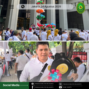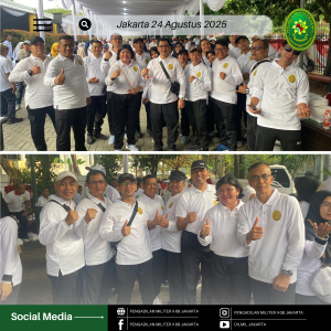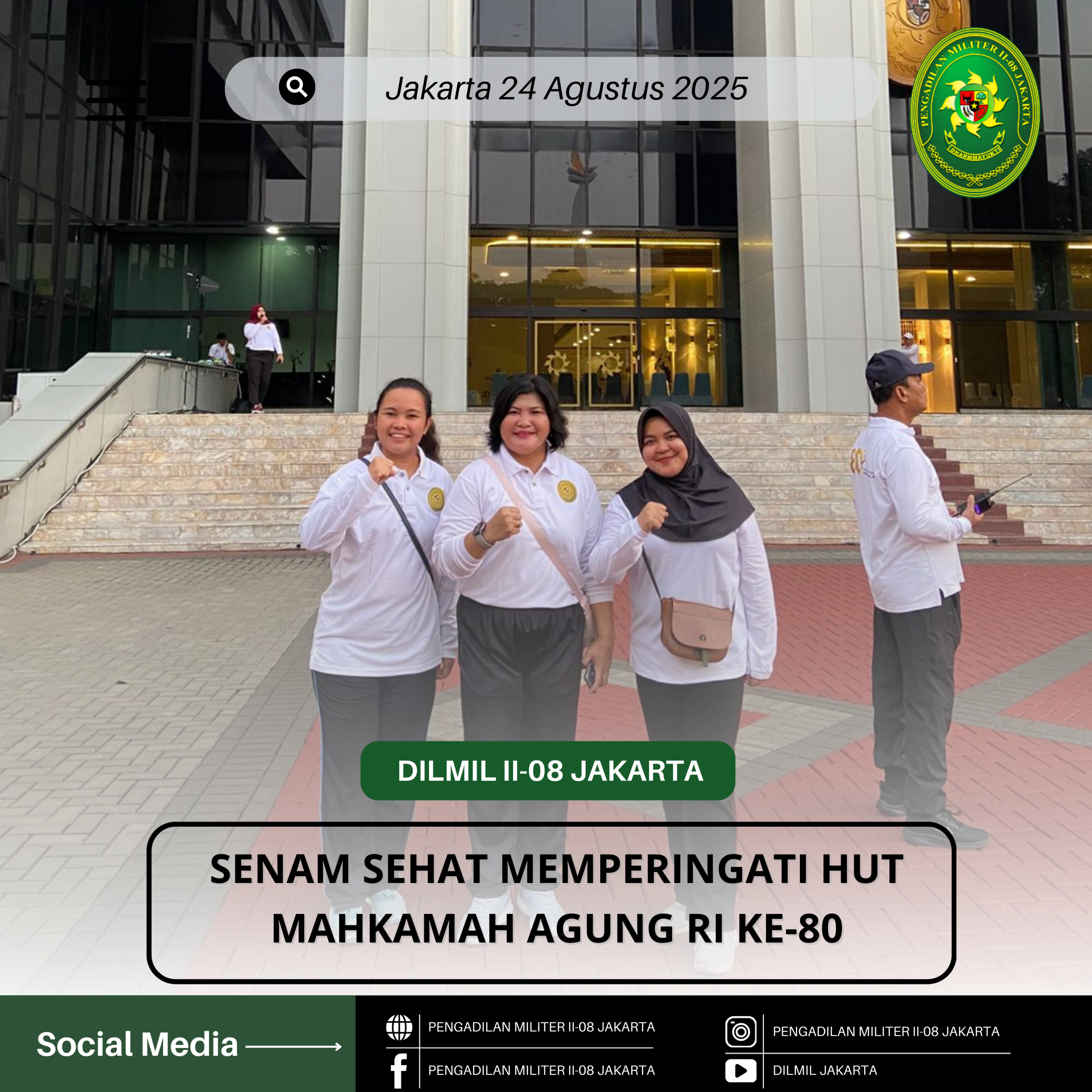 Jakarta, 24 Agustus 2025 – Wakil Kepala Pengadilan Militer II-08 Jakarta, Letkol Chk (K) Silveria Supanti, S.H., M.H., bersama seluruh personel Pengadilan Militer II-08 Jakarta mengikuti kegiatan Senam Sehat dalam rangka memperingati HUT Mahkamah Agung Republik Indonesia Ke-80.