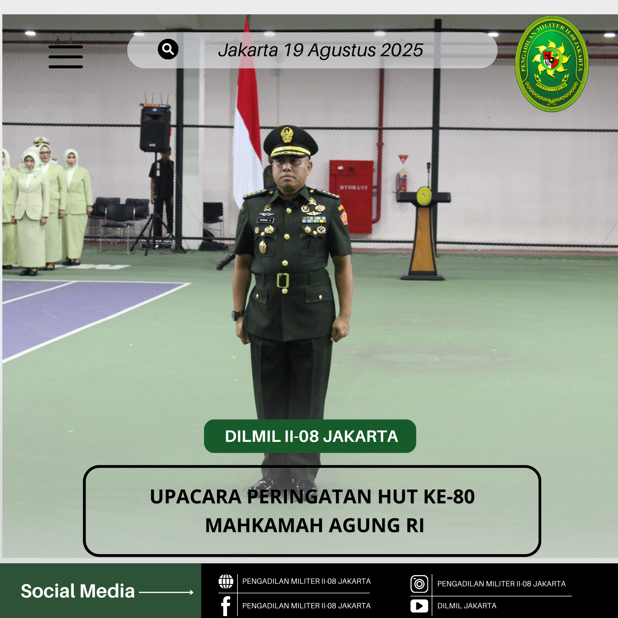 Kepala Pengadilan Militer II-08 Jakarta, Kolonel Chk Sugeng Aryanto, S.H., M.H., bertindak sebagai Komandan Upacara dan bersama seluruh personel Pengadilan Militer II-08 Jakarta menghadiri Upacara Peringatan Hari Ulang Tahun (HUT) ke-80 Mahkamah Agung Republik Indonesia.